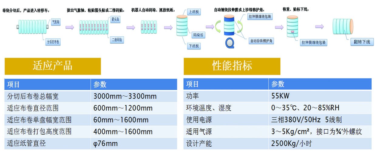 無紡布自動包裝線集軟件系統、周轉搬運、生產線合流、機器人自動碼垛、自動放紙板、自動纏膜打包、自動覆頂模、自動尼龍袋纏繞包裝、自動稱重、自動打印標貼、自動翻轉下線、自動入庫、立體倉庫等流程。