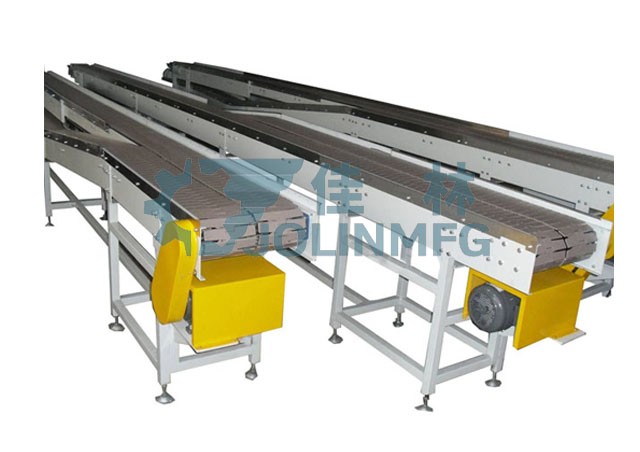 チェーンプレートコンベヤはチェーンプレートを荷重とし、モータ減速機を動力伝達として多列チェーンプレートを並列に通過し、チェーンプレートコンベヤを広くして差速を形成し、多列チェーンプレートの速度差を利用して多列コンベヤを押圧なしで単列コンベヤに変更し、飲料ラベル、充填、洗浄などの設備の単列コンベヤの要求を満たす。2本のチェーンプレートコンベヤのヘッドテール部を重畳式の混合チェーンとしてボトル(タンク)體を動的過剰狀態にし、コンベヤラインに材料を滯留させず、空きボトルおよび実ボトル圧力と無圧力コンベヤを満たすことができる。